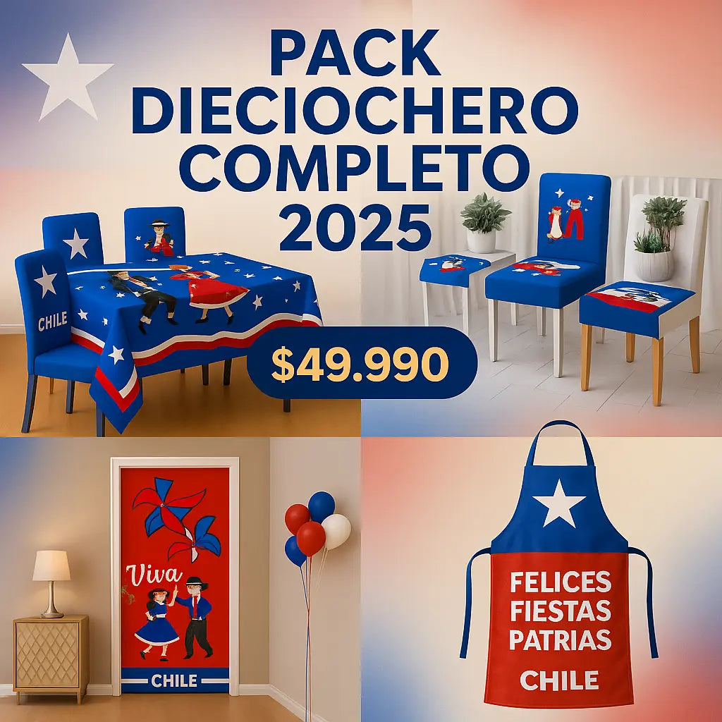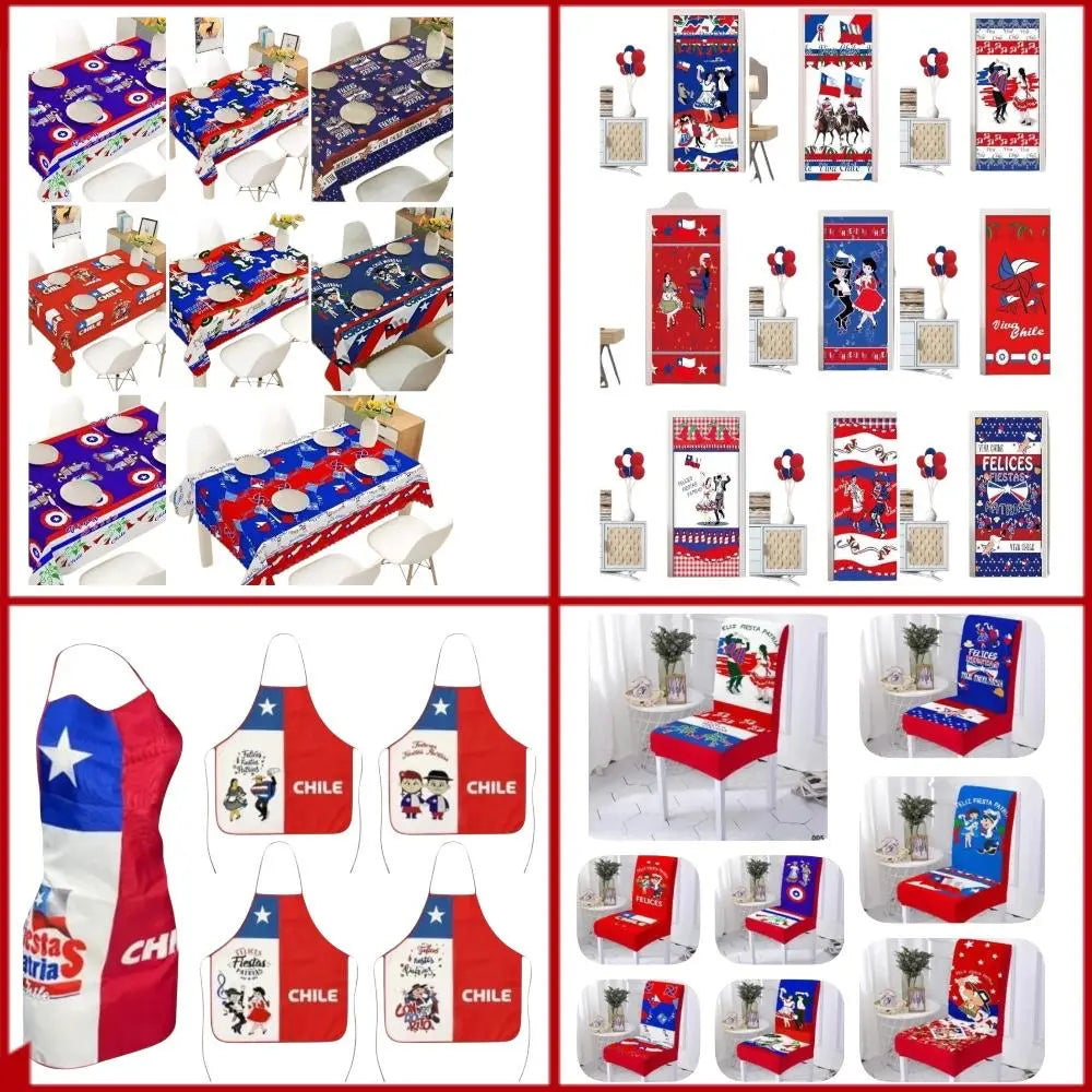 Celebra las Fiestas Patrias con el kit más completo: Mantel + 6 Fundas + Funda Puerta + Delantal. ¡Diseños 100% chilenos que harán brillar tu celebración!
